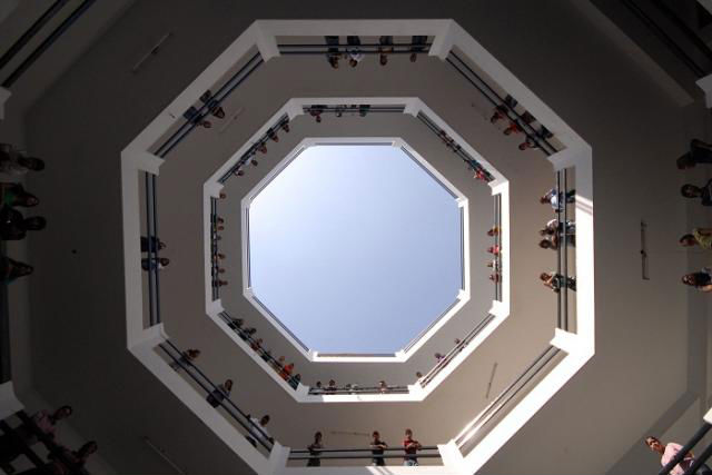 The main building is designed on the traditional concept of an octagonal shaped, centrally located courtyard, which abuts the office. Partially sunk into the ground the building houses an amphitheater to the rear of the courtyard.