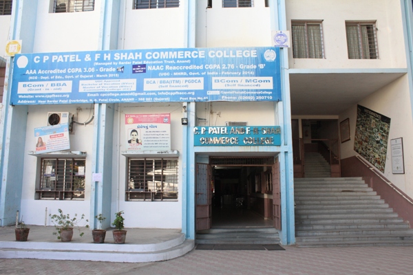 The C.P Patel and F H Shah Commerce College is affiliated to Sardar Patel University, Vallabh Vidyanagar. The College is located on Bhalej Road, one of the fastest developing areas of the Milk City Anand. All infrastructure facilities including classrooms, audio-visual room equipped with modern teaching equipment, computer center, playground, etc. are available on the campus.