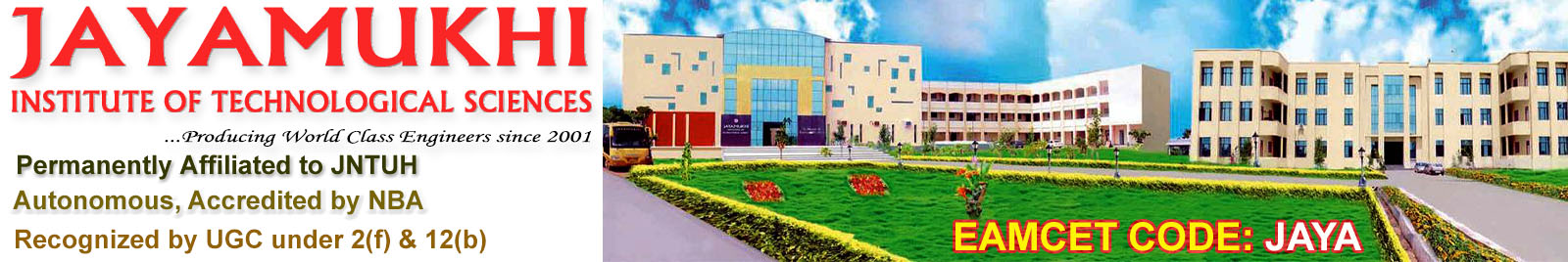 Sponsored by the Jayamukhi Educational Society, the Jayamukhi Institute of Technological Sciences came into being in 2001 to provide quality and contemporary education with social relevance in the engineering faculty with an ultimate vision to maintain global standards in higher learning and research. The Institute has the approval of AICTE and recognized by the Government of Andhra Pradesh. It is permanently affiliated to Jawaharlal Nehru Technological University (JNTU), Hyderabad . The Institute has come upon 40 acres of green pastures in Narsampet, about 30km away from the historic city of Warangal and presents a picturesque and panoramic view.