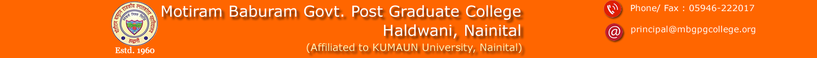 Moti Ram Babu Ram Government Post Graduate College (MBGPG College), Haldwani, is a leading institution of higher education not only in the state but also in the Kumaon region with 46 years of education service. The college is located in the foothills of the Shivaliks and upholds the largest catchment area of the State of Uttarakhand, feeding more than 50 intermediate colleges of this area in Nainital district.