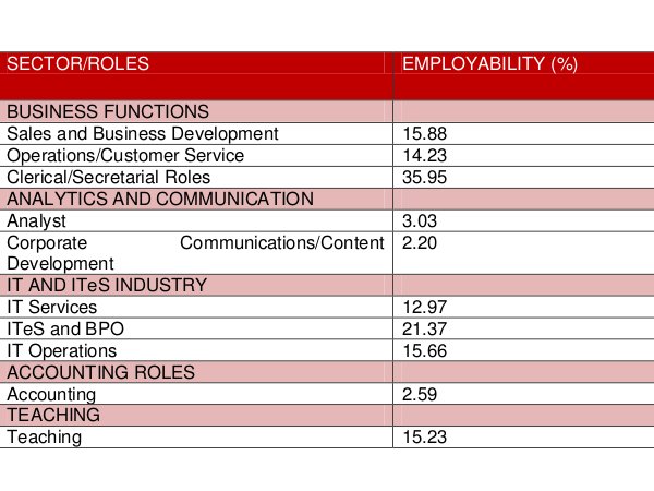 The employability of graduates varies from 2.59% in functional roles such as accounting, to 15.88% in sales related roles and 21.37% for roles in the business process outsourcing (BPO/ITeS) sector.