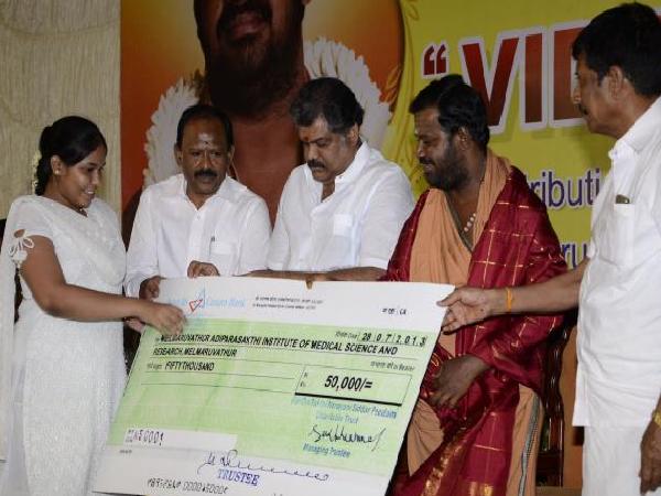 Distributing scholarships worth Rs. 1.10 crore to 600 poor students from different parts of Tamil Nadu under the ‘Vidya Nethram' scheme of Sri Narayani Peedam here, to enable them to pursue professional courses at a function,at the Peedam premises here on Sunday.