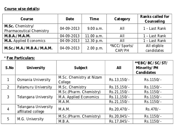 Counselling for the above PG programmes will be held at Office of Directorate of Admissions, Near PGRR CDE, OU campus, Hyderabad.