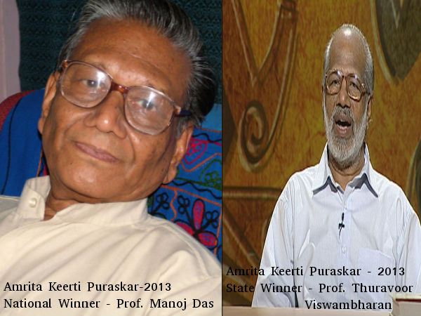Kollam, September 17: Prof. Manoj Das, a towering figure of the English and Oriya literature, will be conferred with the 2013 Amritakeerti Puraskar National Award while eminent writer, scholar and orator Prof. Thuravoor Viswambharan will be honoured with The Kerala State-level award.
