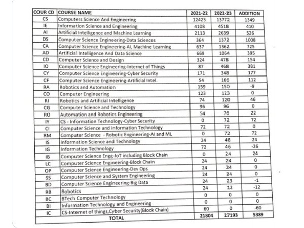 - 1,349 seats have been added to Computers Science and Engineering, while 1,008 more seats have been added to Computer Science Engineering - Data Sciences, and 725 seats added to CSE-Al Machine learning.