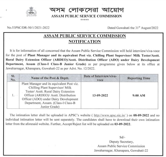 Your interview/viva-voce date for the post of plant manager, chilling plant supervisor, milk tester, assistant rural dairy extension officer, and others has been released by the Assam public service commission (ASPC). It is going to be held on 13 September 2022 from 9.00 a.m. We also have update on when the Admit Card of the same will be made available to download.