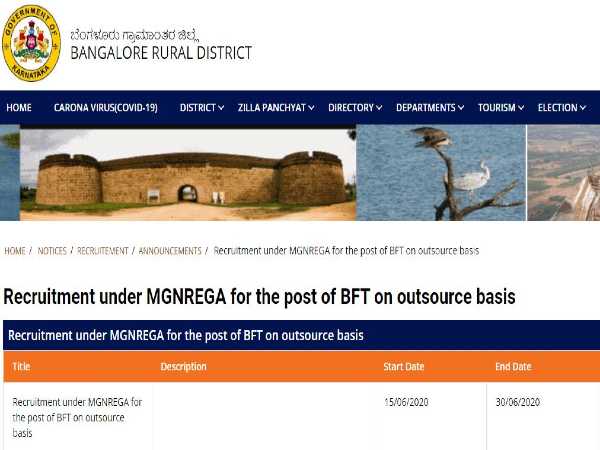 Candidates applying for BFT posts through Bangalore Rural ZP Recruitment 2020 must register online on the official Bangalore Rural District website at https://bangalorerural.nic.in/en/ from June 15, 2020 onwards and submit their applications on or before June 30, 2020 at https://bangalorerural.nic.in/en/notice/recruitment-under-mgnrega-for-the-post-of-bft-on-outsource-basis/