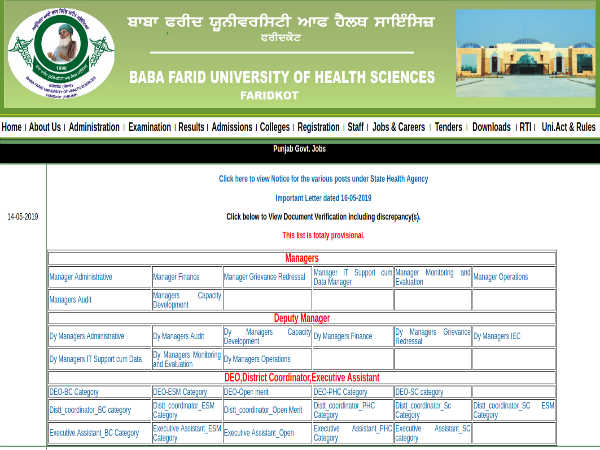 Baba Farid University of Health Sciences (BFUHS), under the Govt. of Punjab, has invited applications from qualified and experienced Indian nationals (male and female) for filling 68 vacancies to the posts comprising Managers, Deputy Managers, Executive Assistants, District Coordinators and Data Entry Operators to be posted in the State Health Agency.