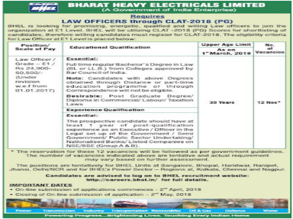 An official employment notification has been released by the Bharat Heavy Electricals Limited (BHEL) on its official website for the recruitment of Law Officer through CLAT 2018 (PG) score. Interested and eligible candidates should start applying from Apr 2, 2018.