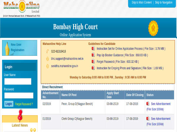 Candidates applying for Clerks post through Bombay High Court Recruitment must submit their applications through online mode on the official High Court of Bombay website at https://bhc.mahaonline.gov.in/FORMS/Home.aspx on or before August 17, 2019.