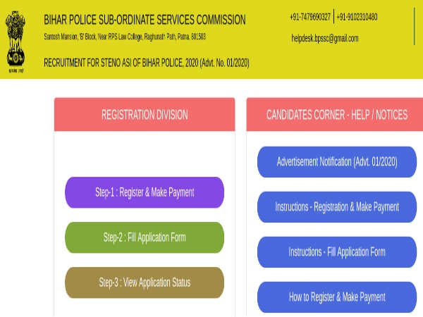 Candidates applying for Assistant Sub Inspectors post through BPSSC Notification must register online on the official BPSSC website at http://bpssc.bih.nic.in/ from March 4, 2020 onwards, and submit their applications on or before March 30, 2020 at https://apply-bpssc.com/Steno/applicationIndex