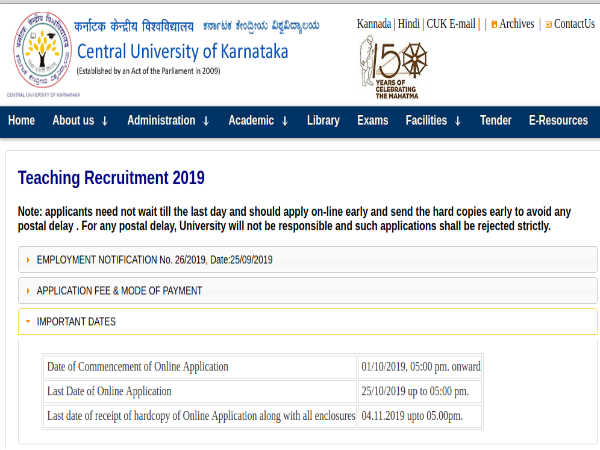 Candidates applying for Faculty posts through Central University of Karnataka must register online on the official CUK website at https://www.cuk.ac.in/Teaching-Recruitment- Sept2019.aspx on October 1, 2019, and submit their applications on or before October 25, 2019 by 5:00 pm.