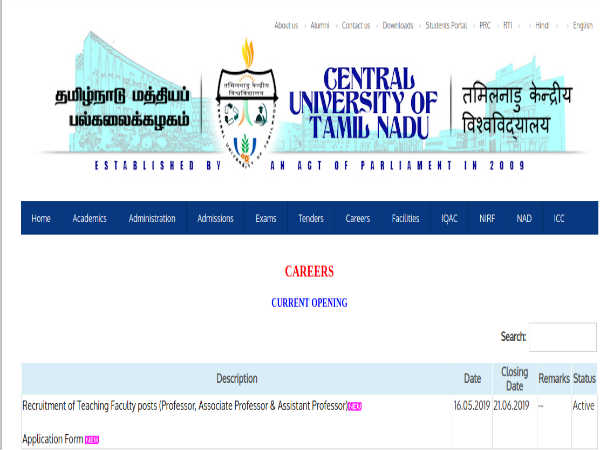 The Tamil Nadu Central University has invited applications in a prescribed format from qualified and experience Indian nationals for filling 113 Faculty positions comprising Professors, Associate Professors and Assistant Professors under various departments/disciplines comprising Mathematics, Applied Mathematics, Statistics, Computer Science, Physical Education, Sports, Law, Horticulture & Floriculture, Geology, Microbiology, Management, Physics, Commerce, Education, English, Tamil, Economics, Social Work, Management, Life Sciences, Tourism, Hospitality Management, Mass Communication & Media, Geography, History etc. The offline application process towards the same starts from May 16, 2019 and closes on June 21, 2019