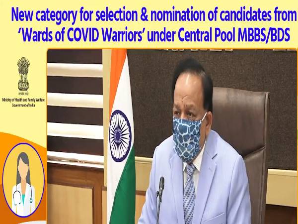 The Union Ministry of Health and Family Welfare has approved the introduction of a new category called 'Wards of COVID Warriors' for selection and nomination of candidates under the Central Pool MBBS/BDS seats for the academic year 2020-21 as a gesture to honour the COVID warriors for serving humanity amid pandemic.