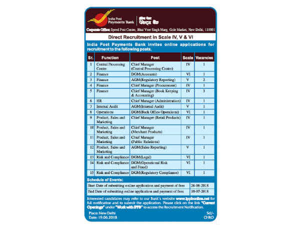 India Post Payment Bank (IPPB) has released an employment notification calling out aspirants to apply for various posts. Those interested can check out the eligibility, salary scale, how to apply and the complete details of the government job here. Selected candidates can earn up to level 6 pay matrix. The last date to apply for the government jobs is July 10, 2018.
