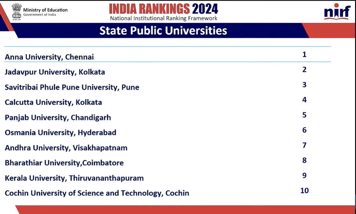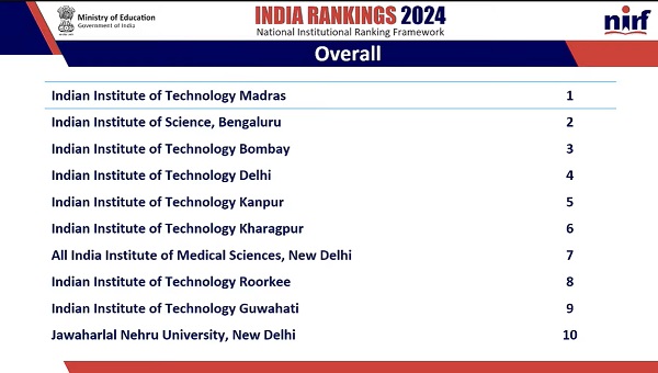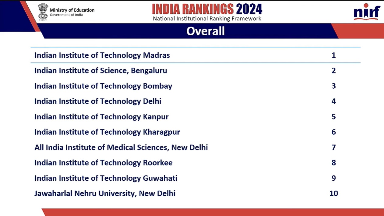 NIRF 2024: 8 IITs, AIIMS Delhi and Jawaharlal Nehru University in top ten list.