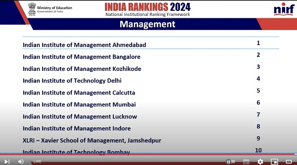 Lets see the list of Top Management Colleges in India as per NIRF Rankings 2024.