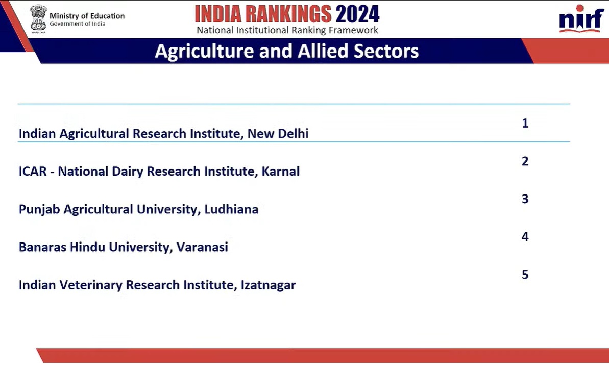 Indian Agricultural Research Institute was on the top of the list in 2023 for Agriculture and Allied Sectors.