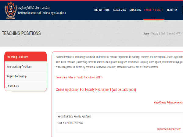 Candidates applying for Faculty Positions through NIT Rourkela Recruitment 2019 must submit their applications through online mode on or before April 30, 2019 on the official NIT Rourkela website at http://nitrkl.ac.in/