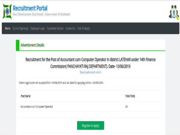 Candidates must register and apply online on or before June 30, 2019 at https://applyrdd.jharkhand.gov.in/AdvtDetails.aspx?id=57z6qmbkxlI5/EfZRtr37w==