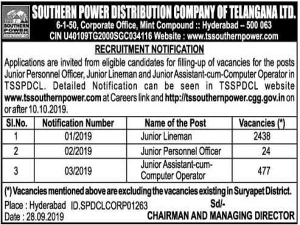 The Southern Power Distribution Company of Telangana Limited (TSSPDCL), under Govt. of Telangana, has issued an advertisement, invited online applications from eligible and interested candidates for filling 2,939 vacancies to the post of Junior Lineman (JLM), Junior Personnel Officer (JPO) and Junior Assistant-cum-Computer Operators (JCO) through direct selection. The online application-cum-registration process towards the same starts from October 10, 2019 and closes on November 11, 2019.