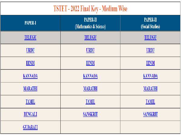 The TSTET Final Answer Key 2022 is released for Paper-I and Paper-II (Mathematics & Science and Social Studies) for different mediums. The mediums for which the TSTET Answer Key 2022 is released include Telugu, Urdu, Hindi, Kannada, Marathi, Tamil, Bengali, Gujarati for Paper-I and Telugu, Urdu, Hindi, Kannada, Marathi, Tamil and Sanskrit mediums for Paper-2 for which the Telangana TET Initial Key 2022 is released.