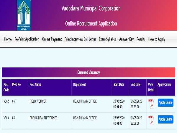 Candidates applying for Field Workers and PHWS post through Vadodara Municipal Corporation Jobs 2020 must register online on the official VMC website at https://vmc.gov.in/OnlineRecruitment/Recruitment.aspx and submit their applications on or before May 31, 2020.