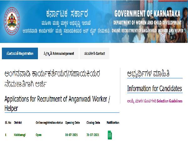 Candidates applying for WCD Kalaburgi Anganwadi Jobs 2021 through WCD Kalaburgi Recruitment 2021 must register online on the Karnataka DWCD website from July 1, 2021 onwards and submit their applications before July 31, 2021 by 05:30 pm.